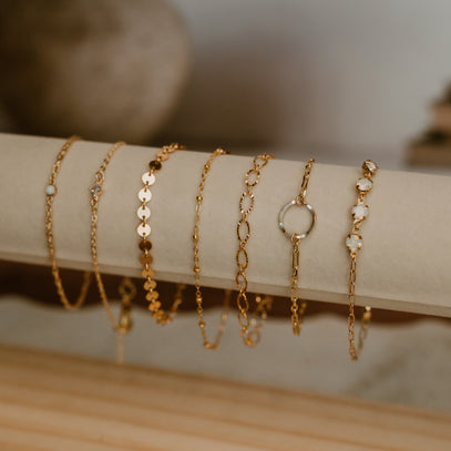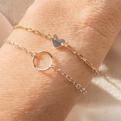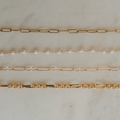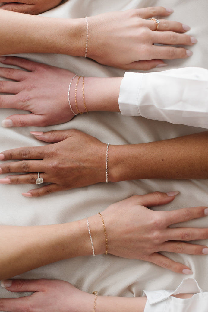 Chain that is custom fitted and welded together rather than connected with a clasp. You can create a bracelet, necklace, ring, anklet or hand chain. J. Rose Designs offers 14k gold filled and sterling silver chains.